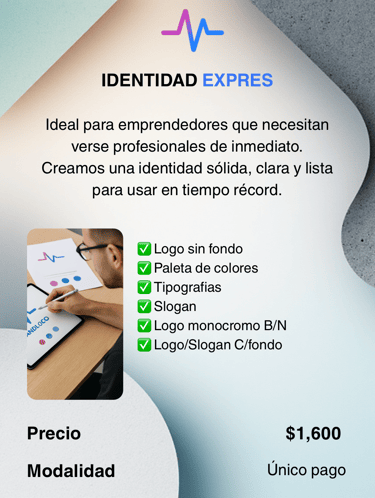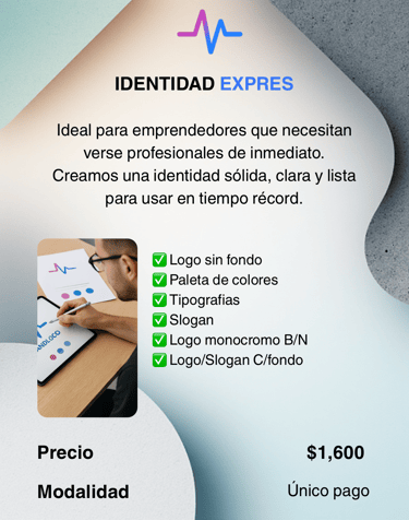 Un logo, paleta de colores, tipografías y 3 piezas listas para usar.